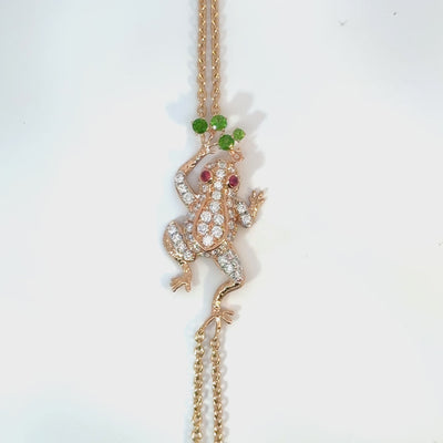 مصنوعة يدوياً من الذهب الوردي عيار 18 قيراط (أو الذهب المطلي)، يتألق جلد الضفدع بـ 54 ماسة بيضاء طبيعية (0.45 قيراط، اللون F، VS1) أو الياقوت الأبيض.